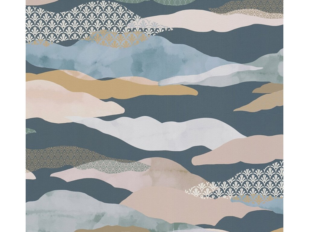 Hladká vliesová tapeta na zeď s grafickým vzorem vln v odstínech hnědé, zelené, modré a růžové barvy.